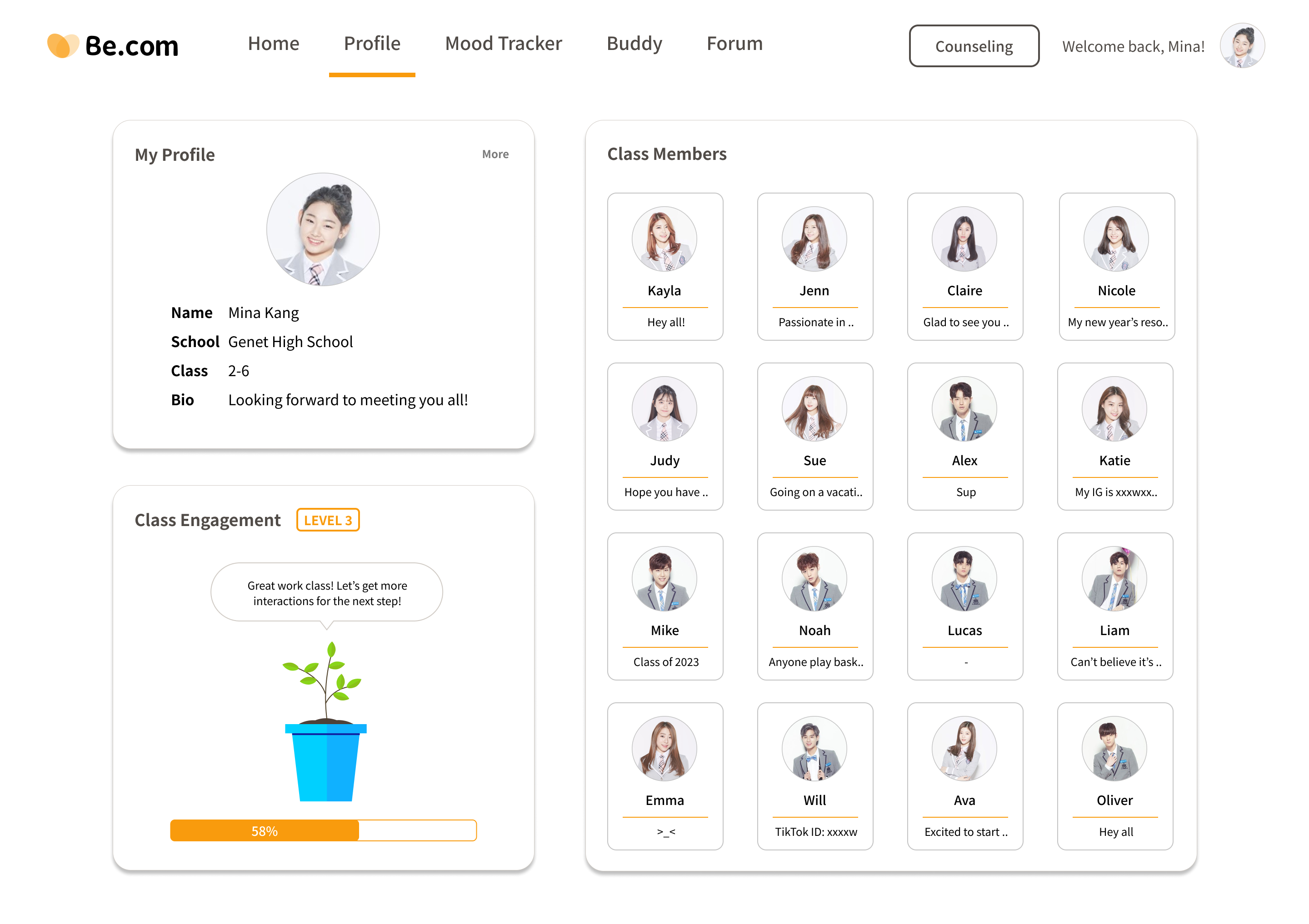 With features that connect oneself, friends, and the class, students can create in-class social connections and grow by introspecting themselves.